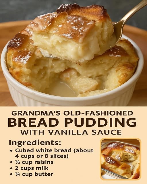 There’s something timeless and comforting about a warm dish of old-fashioned bread pudding—the kind that fills the kitchen with the aroma of cinnamon, butter, and vanilla. This classic dessert transforms simple, everyday ingredients into something truly special. Soft on the inside, golden on top, and drizzled with a luscious homemade vanilla sauce, this recipe tastes just like Grandma used to make.