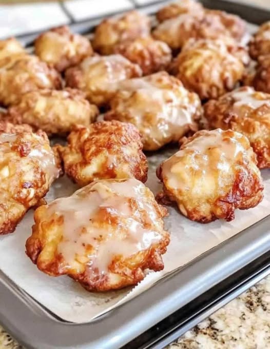 Warm fritters absorb glaze beautifully, giving a sweet, delicate coating.