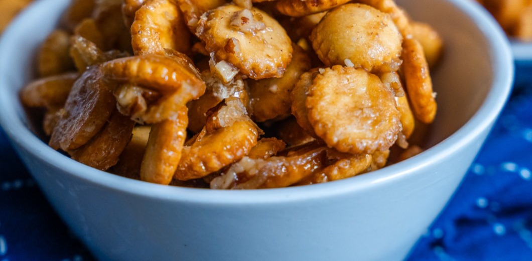 Place the oyster crackers in a large mixing bowl. Add the roughly chopped pecans, distributing them evenly among the crackers.