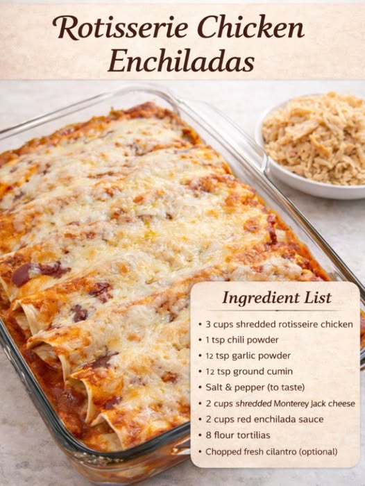 Easy Rotisserie Chicken Enchiladas prove that great flavor does not require complicated preparation. With tender chicken, creamy filling, and bold sauce, this recipe earns a permanent spot in any dinner rotation.