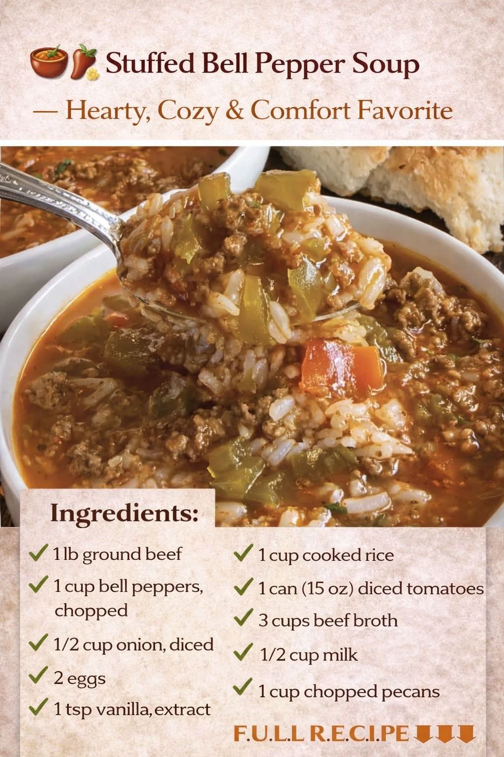 Stuffed Bell Pepper Soup takes everything we love about traditional stuffed peppers—savory beef, sweet bell peppers, tender rice, and rich tomato broth—and transforms it into a warm, spoonable comfort meal. Instead of stuffing and baking peppers one by one, this soup brings all those familiar flavors together in one easy pot.