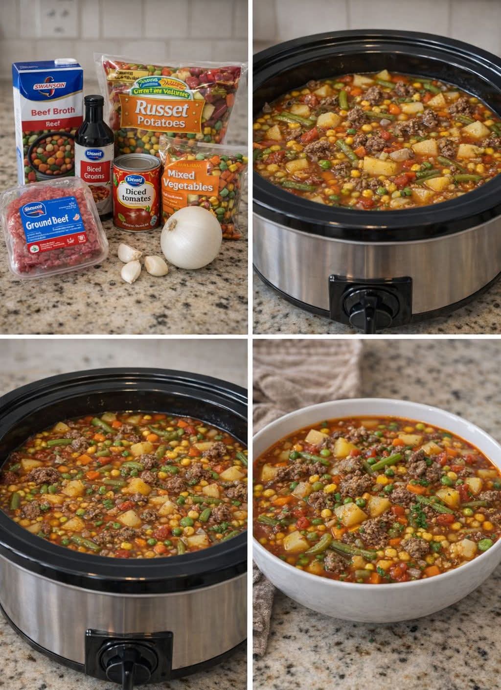 Brown beef first, then transfer everything to slow cooker. Cook on LOW for 6–8 hours or HIGH for 3–4 hours.