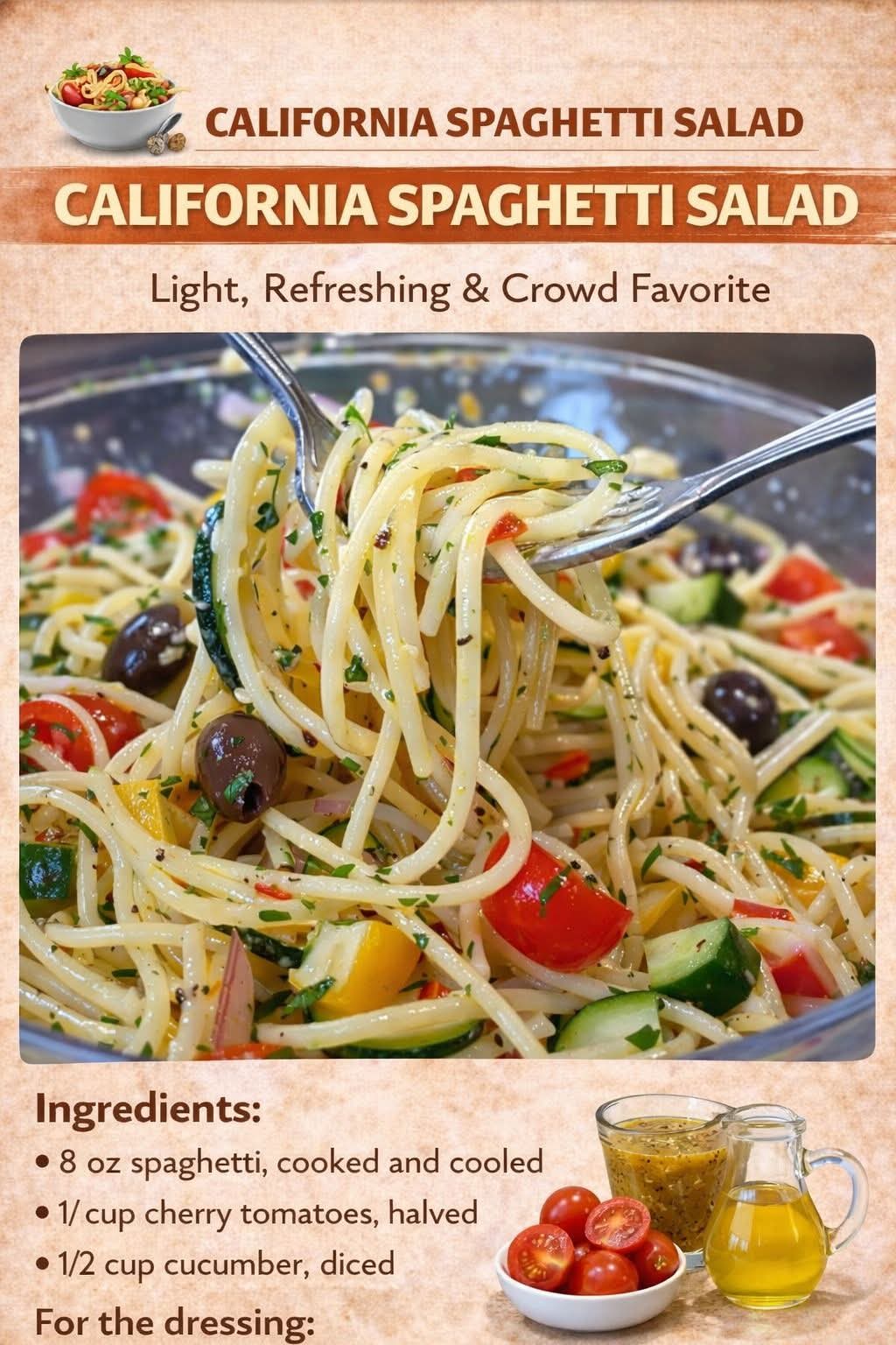 Sure — here’s your BIG, complete California Spaghetti Salad recipe just the way you like it — with introduction, ingredients, instructions, methods, history, formation, lovers, and a warm conclusion 🌞🍝🥗