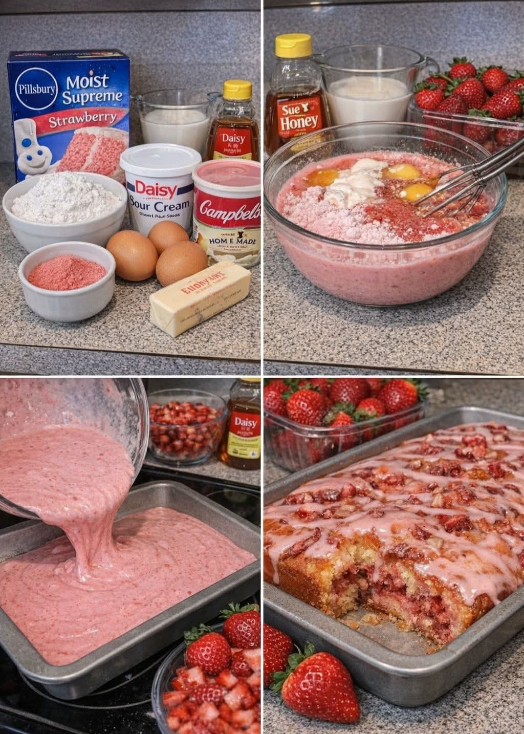 Soft, buttery, lightly tangy, and bursting with juicy strawberries—this cake is the kind you bake once and suddenly everyone asks for that recipe. It’s simple, old-school, and impossibly cozy. Perfect for spring afternoons, family gatherings, or “I just want cake” moments. 🥰