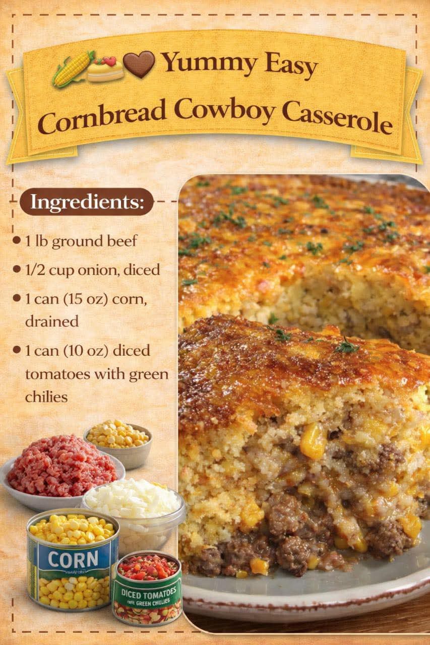 “Cowboy Casserole” comes from classic American ranch cooking — hearty, affordable meals that could feed hardworking ranch hands after long days on the range. Cornbread has deep roots in Southern and Western American cooking, dating back to Native American cornmeal traditions and later adopted by settlers.