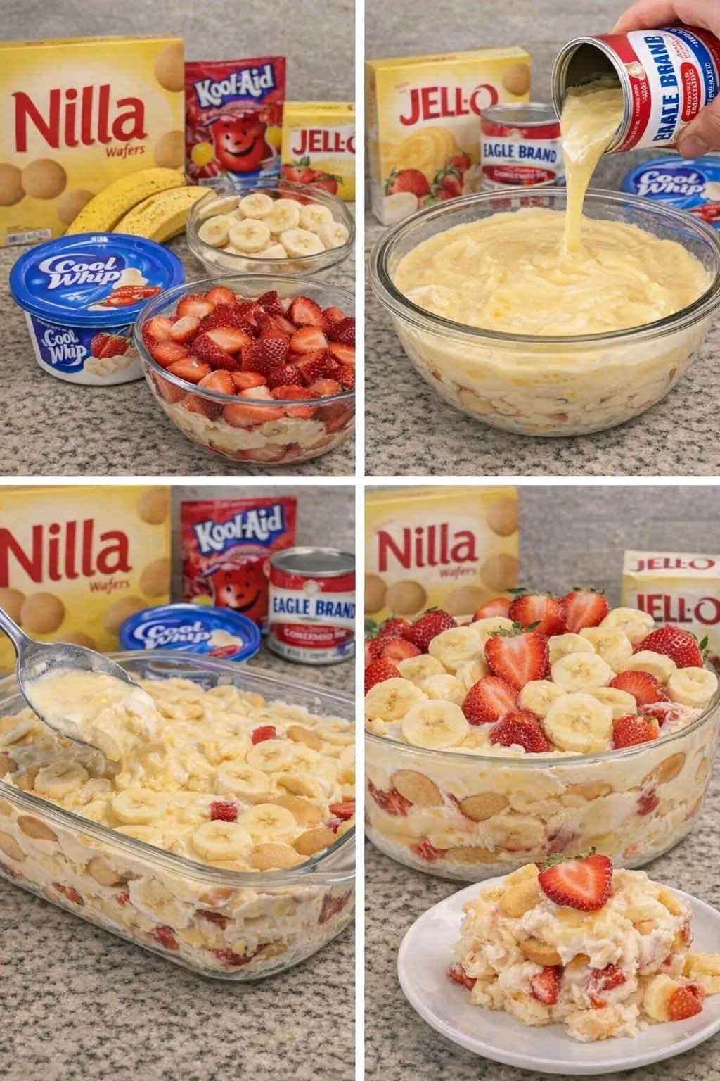 Adding strawberries is a modern twist — bringing brightness, color, and a fresh berry flavor that balances the rich pudding and sweet bananas beautifully. It’s the perfect upgrade to a beloved classic!