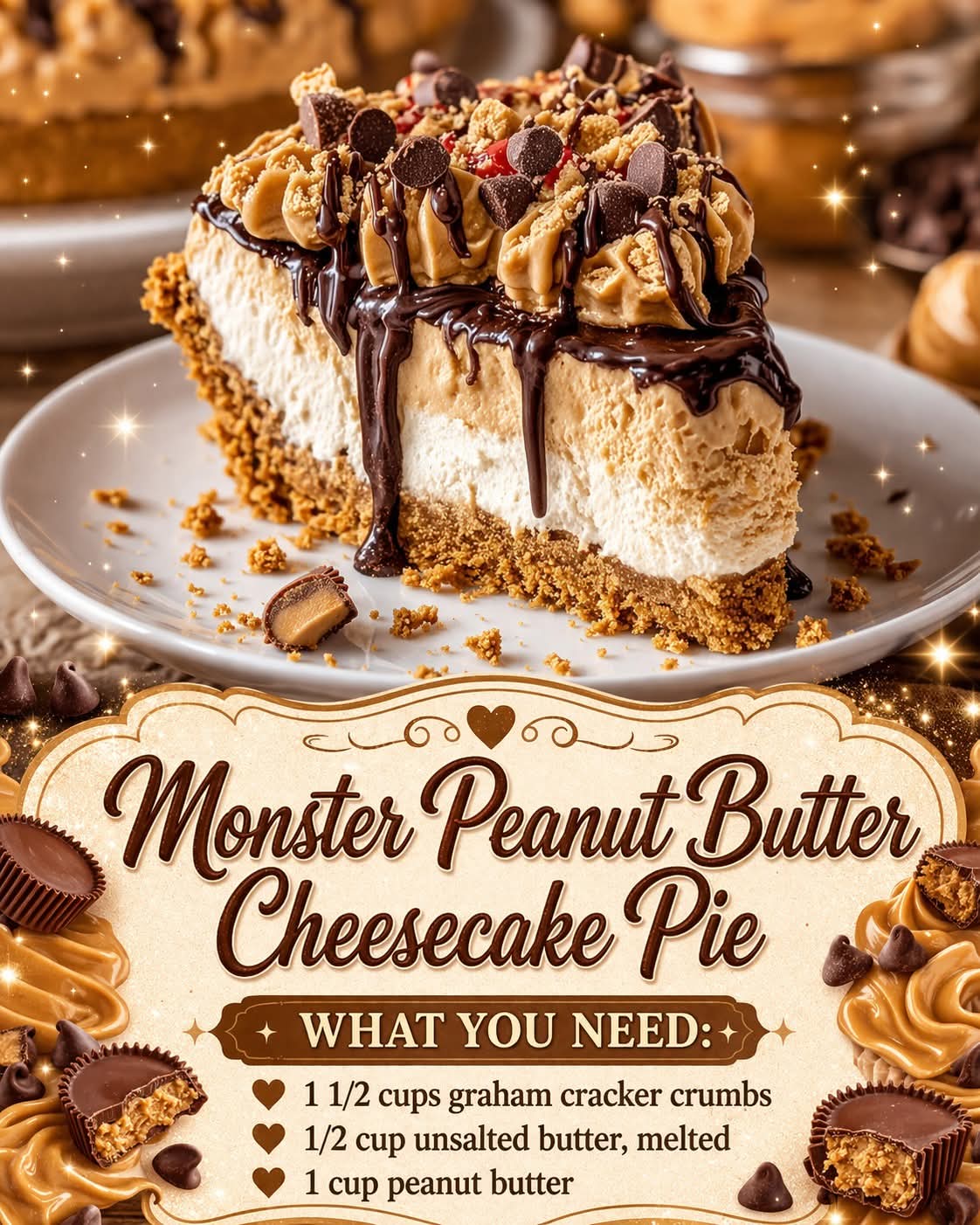 A rich, over-the-top dessert for true peanut butter lovers, this Monster Peanut Butter Cheesecake Pie combines a buttery graham cracker crust, a velvety peanut butter cheesecake filling, and indulgent toppings that make every slice unforgettable. It’s creamy, sweet, slightly salty, and loaded with texture—perfect for celebrations, holidays, or when you simply want to impress with minimal baking effort.